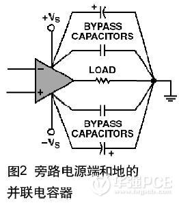 直接從運算放大器的電源引腳入手;具有最小電容值和最小物理尺寸的電容器應(yīng)當(dāng)與運算放大器置于PCB的同一面——而且盡可能靠近放大器。電容器的接地端應(yīng)該用最短的引腳或印制線直接連至接地平面。上述的接地連接應(yīng)該盡可能靠近放大器的負載端以便減小電源端和接地端之間的干擾。圖2示出了這種連接方法。