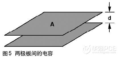 當(dāng)尋找有問題的寄生源時,可能用得著幾個計算上述那些寄生電容尺寸的基本公式。公式(1)是計算平行極板電容器(見圖5)的公式。