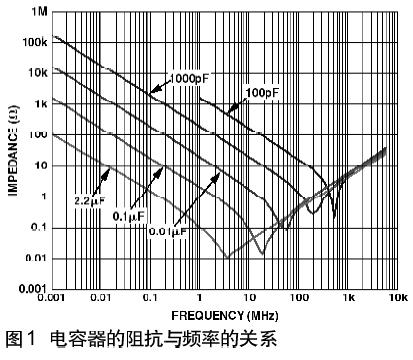 并聯(lián)不同的電容值的電容器有助于確保電源引腳在很寬的頻帶上只能看到很低的交流(AC)阻抗。這對于在運算放大器電源抑制比(PSR)衰減頻率處尤其重要。該電容器有助于補償放大器降低的PSR。在許多十倍頻程范圍內(nèi)保持低阻抗的接地通路將有助于確保有害的噪聲不能進入運算放大器。圖1示出了采用多個并聯(lián)電容器的優(yōu)點。在低頻段,大的電容器提供低阻抗的接地通路。但是一旦頻率達到了它們自身的諧振頻率,電容器的容性就會減弱,并且逐漸呈現(xiàn)出感性。這就是為什么采用多個電容器是很重要的原因:當(dāng)一個電容器的頻率響應(yīng)開始下降時,另一個電容器的頻率響應(yīng)開始起作用,所以能在許多十倍頻程范圍內(nèi)保持很低的AC阻抗。