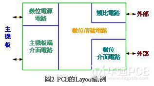 圖2是典型的印刷電路基板Layout范例,如圖所示該電路基板是復(fù)數(shù)個電路基板之中的一片,此時只要透過主機板就能夠進行信號交易。主機板執(zhí)行基板之間的數(shù)據(jù)交易時通常會有Bus通行,雖然圖2的基板主體是數(shù)字電路,不過卻混載小規(guī)模的模擬電路。