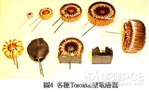 電感器一旦使直流重迭時,由于直流成份的影響造成電感值大幅降低。此外電源用電感會有很大的直流電流動,因此必需選擇適合的電感器。一般電源基板入口處設(shè)置的電感器,大多使用圖4的Toroidal型電感器。