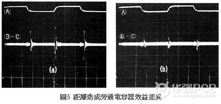 圖5是距離與旁通電容器的互動特性測試結(jié)果,圖5(a)的旁通電容器與IC的距離為10cm,圖5(b)為3cm,兩者其它條件完全相同,不過(a)與(b)的效果卻截然不同,距離為10cm時旁通電容器幾乎未發(fā)揮任何作用。