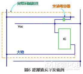 圖6的旁通電容器外觀上看似非常靠近IC,實際卻是典型的設(shè)計不當(dāng)范例。旁通電容器的效果,基本上取決于電源-大地-圖案三者之間的回繞方式,雖然旁通電容器的效果非常大,不過布線的阻抗也非常重要,因此設(shè)計上通常會使用非常粗大的圖案(圖7)。