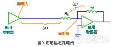 如圖9所示驅(qū)動與接收端之間插入高阻抗組件時,高阻抗組件與接收端之間的布線會變成高阻抗,此時必需縮減高阻抗部份的布線長度,加長低阻抗部份的布線長度。圖9中的接收器為反相增幅器,由于應(yīng)用增幅器的輸入阻抗很高,因此電阻器RS與RF之間的(B)屬于高阻抗,換言之此時必需縮減該部位的布線長度,加長(A)部位的布線長度