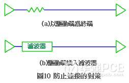 高頻噪訊(noise)不但會在信號線內(nèi)部傳遞,還會透過信號線放射散播,因此單純在接收端設(shè)置濾波器,過濾連接的效果非常有限,根本對策是徹底消弭連接(圖10)。信號頻率很高時,延緩信號的站立方法容易造成信號本身遲鈍,另外一種方法是使接收端適當(dāng)終結(jié)藉此消除連接,不過終結(jié)接收端時電流仍舊在流動它會消費電力,基于省能源等考慮一般都是采取驅(qū)動端終端設(shè)計方式。