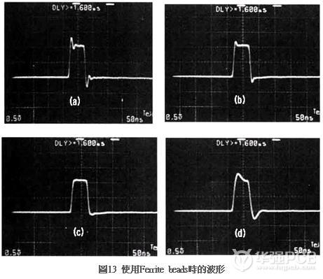 圖13是實際使用Ferrite beads時的波形,值得一提的是Ferrite beads并非連接至基板內(nèi)的圖案,而是直接與接口連接。如圖所示13(a)是無Ferrite beads時的波形;圖(b)~(d)分別是逐漸增加Ferrite beads電感值時的波形。