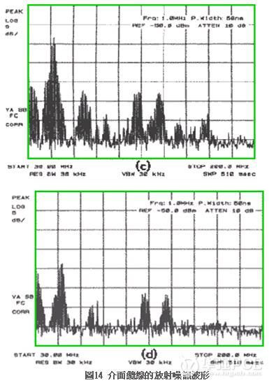 圖13(b)仍舊殘留若干連接;圖13(d)出現(xiàn)癱陷(sag),圖中水平部位應(yīng)該呈平整狀,實際上卻是急遽下降之后略為提高,至于癱陷則是電感值過大造成的特殊現(xiàn)象。圖13(c)被認(rèn)為最適宜的Ferrite beads。數(shù)字信號的場合,圖13(d)比較妥適,不過即使是圖13(d)的波形也不會引發(fā)誤動作。若與圖13(c)比較,信號的高頻成份反而大幅減少,其結(jié)果如圖14所示,來自信號信的放射噪訊亦隨著降低。