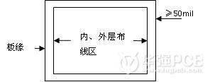 3.導(dǎo)線布層、布線區(qū)的要求 一般情況下,多層印制板布線是按電路功能進(jìn)行,在外層布線時(shí),要求在焊接面多布線,元器件面少布線,有利于印制板的維修和排故。細(xì)、密導(dǎo)線和易受干擾的信號(hào)線,通常是安排在內(nèi)層。大面積的銅箔應(yīng)比較均勻分布在內(nèi)、外層,這將有助于減少板的翹曲度,也使電鍍時(shí)在表面獲得較均勻的鍍層。為防止外形加工傷及印制導(dǎo)線和機(jī)械加工時(shí)造成層間短路,內(nèi)外層布線區(qū)的導(dǎo)電圖形離板緣的距離應(yīng)大于50mil,如下圖: