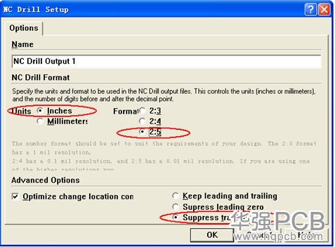 6:出現(xiàn)NC Drill setup 對(duì)話框,在這里我們?cè)O(shè)置鉆孔文件的坐標(biāo)格式及單位