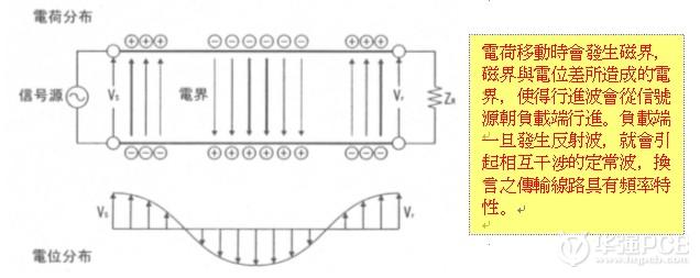 如圖1所示如果兩線路之間產(chǎn)生電位差,兩線路之間就會(huì)發(fā)生電界,隨著電荷的變化就會(huì)出現(xiàn)高頻波的流動(dòng)(亦即電流),它可視為磁界的變化,因此隨著電界與磁界,行進(jìn)波會(huì)流入負(fù)載端,如果傳輸線路的阻抗為不整合狀態(tài)時(shí),負(fù)載端就會(huì)產(chǎn)生反射波(亦即反射電力),造成行進(jìn)波與反射波相互干擾,進(jìn)而在傳輸線路上形成類似靜止?fàn)畹牟ㄐ紊焦?亦即定常波),使得傳輸線路具有頻率特性。當(dāng)傳輸線路為 時(shí),干涉所產(chǎn)生的波長成為共振狀態(tài),傳輸線路就成為發(fā)射噪訊的天線,進(jìn)而嚴(yán)重影響電子機(jī)器的正常動(dòng)作,也就是說具有電界、磁界的高頻波電流的流動(dòng)所產(chǎn)生的電磁界,經(jīng)常超越預(yù)料將強(qiáng)烈的電波放射至周圍空間。