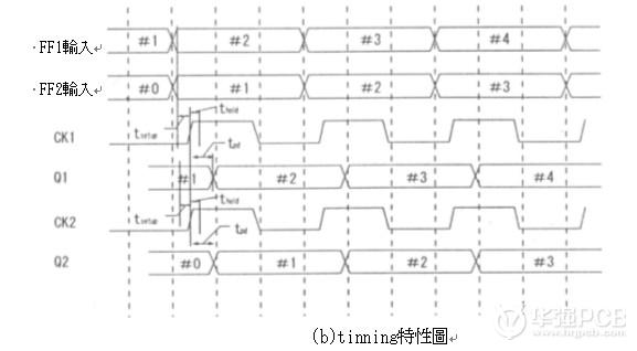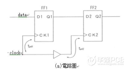 圖10(b)表示可忽略tinning偏差亦即tpd2-tpd1≈0,換言之從輸出端子祇輸出IC規(guī)格書標(biāo)示的信號(hào)傳輸延遲時(shí)間內(nèi)的延遲信號(hào),實(shí)際上由于IC的延遲與pattern長度所造成的影響有大小區(qū)分,因而產(chǎn)生clock之間產(chǎn)生延遲時(shí)間差異,如果延遲時(shí)間差異過多時(shí),會(huì)發(fā)生數(shù)據(jù)異?,F(xiàn)象,此時(shí)FF2的clock無法維持讀入的FF1輸出數(shù)據(jù)set up時(shí)間與hold時(shí)間,最后導(dǎo)致FF2的輸出變得非常不穩(wěn)定。