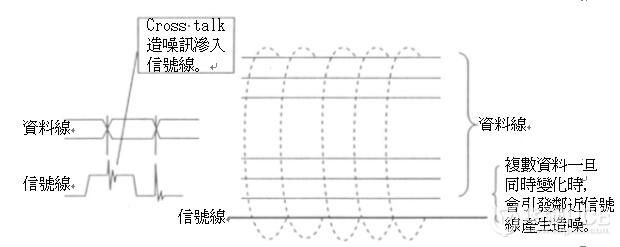 如圖12所示由于數(shù)據(jù)線(data line)產(chǎn)生的cross talk,使得噪訊滲入其它信號(hào)線,往往是造成電路誤動(dòng)作的原因之一。數(shù)據(jù)線有復(fù)數(shù)個(gè)數(shù)據(jù)同步變化,所以電流變化相當(dāng)大,如果噪訊滲入信號(hào)線就會(huì)造成重大影響。如果該信號(hào)線是同步化邏輯電路時(shí),即使受到cross talk噪訊干擾,祇要同步化tinning的噪訊未滲入,也不會(huì)造成電路誤動(dòng)作。相隔很近的信號(hào)線同步化對抑制噪訊也具有很好的效應(yīng)。