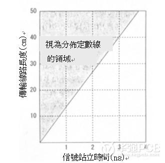 如果考慮IC/LSI的輸出入阻抗時(shí),CMOS type的輸出阻抗一般為數(shù)十Ω,輸入阻抗則高達(dá)數(shù)百Ω,輸出阻抗值與傳輸線路的特性阻抗值非常近似(大約為50~100Ω),相較之下輸入阻抗值就非常大,為了有效抑制反射必需在收信端進(jìn)行與終端相等的特性阻抗,不過基于耗電性等考慮上述方式并非上策,最好的方法是將傳輸線路當(dāng)作集中定數(shù)線路處理,也就是說在無終端的前提下,利用傳輸線路的長度進(jìn)行導(dǎo)線layout使信號(hào)能被順利傳送。傳輸線路使用集中定數(shù)線路或是分布定數(shù)線路,取決于數(shù)字信號(hào)的站立時(shí)間,圖6是信號(hào)的站立時(shí)間與輸線路長度的依存關(guān)系。