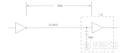 【計(jì)算例4】如圖7所示由micro strip line所構(gòu)成的傳輸線路,從該線路(特性阻抗為)距離信號(hào)端100mm的位置具有10pF輸入負(fù)載容量時(shí),試算它的傳輸延遲時(shí)間 "。如以上介紹利用micro strip line傳輸延遲時(shí)間 "時(shí):