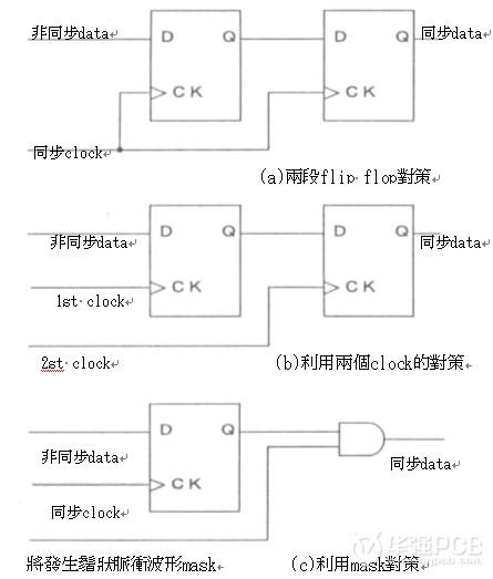 1.flip flop分成兩段使用如圖9所示即使因Metastable發(fā)生須狀脈沖波形,利用兩段flip flop方式(以下簡稱為FF)亦能去除下個(gè)tinning,具體方法是用第一段flip flop讀入數(shù)據(jù)并將數(shù)據(jù)latch,接著再用第二段flip flop輸出數(shù)據(jù),如此便可去除須狀脈沖波形。2.圖9(b)的對策是用第一個(gè)clock(1st)將數(shù)據(jù)latch,再輸出時(shí)間稍為延緩的數(shù)據(jù)(利用共通clock將數(shù)據(jù)latch時(shí),會(huì)選則具備所有數(shù)據(jù)的tinning)。3.圖9(c)的對策是在發(fā)生須狀脈沖波形期間使用mask方式,由于發(fā)生須狀脈沖波形的時(shí)間隨著IC高速化會(huì)變得很短,因此clock的周期很快的場合,使用高速IC反而變成非常smart。事實(shí)上即使因Metastable造成誤動(dòng)作,不過它的發(fā)生機(jī)率卻比預(yù)期低(例如一周或二周發(fā)生一次左右),因此大多數(shù)的情況都無法追究真正的發(fā)生原因。由于高速clock電路會(huì)有信號(hào)延遲傳輸?shù)睦_,因此設(shè)計(jì)上必需設(shè)法滿足set up time與hold time規(guī)格。此外Meta stable經(jīng)常因電源與溫度發(fā)生變動(dòng)也是必需加以防范。