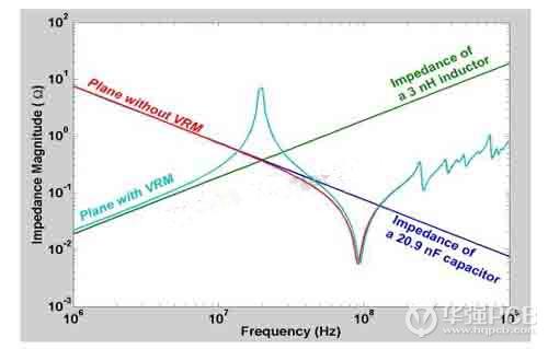 在交流分析中,PCB的電源地阻抗諧振是個特有的現(xiàn)象。圖3展示了一對電源板層的輸入阻抗。為了比較,圖中還畫了一個純電容和一個純電感的阻抗特性。板的尺寸是30cm×20cm,板間間距是100um,填充介質(zhì)是FR4材料。板上的電源整流模塊用一個3nH的電感來代替。顯示純電容阻抗特性的是一個20nF的電容。從圖上可以看出,在板上沒有電源整流模塊時,在幾十兆的頻率范圍內(nèi),平板的阻抗特性(紅線)和電容(藍線)一樣。在100MHz以上,平板的阻抗特性呈感性(沿著綠線)。到了幾百兆的頻率范圍后,幾個諧振峰的出現(xiàn)顯示了平板的諧振特性,這時平板就不再是純感性的了。