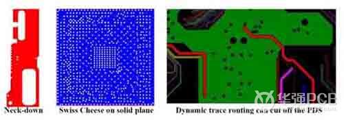 電源板層上有Swiss-Chess結(jié)構(gòu)、Neck-Down結(jié)構(gòu)和動態(tài)布線造成的板平面被分割等情況(圖1);電源板層上電流通過的器件管腳、過孔、焊球、C4凸點的數(shù)量不夠,電源平板厚度不足,電流通路不均衡等;系統(tǒng)設(shè)計需要低電壓、大電流,又有較緊的電壓浮動的范圍。