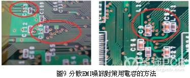 實際應用時只要在頻率導線、Bus導線等高頻導線圖案(Pattern)附近、形成CPU、Return路徑的內(nèi)層面(Plane)的分斷附近、形成噪訊出入口的基板側面附近分散設置EMI噪訊對策用電容,就可以消除該部位周邊的噪訊。