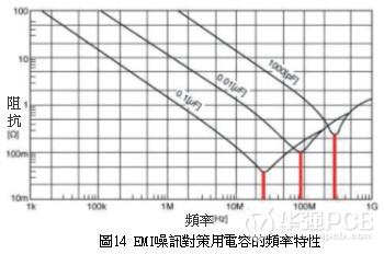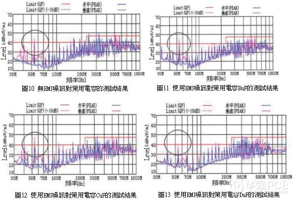 圖10~圖13是改變上述電容容量時的EMI噪訊測試結果,根據(jù)測試結果顯示,依照圖14的頻率范圍設置的大容量EMI噪訊對策用電容DuF,可以抑制低頻噪訊Level。雖然設置電容增加PCB的容量負載,不過為了要抑制噪訊,設置在各部位的電容頻率特性,卻可以發(fā)揮預期的EMI噪訊抑制效果。