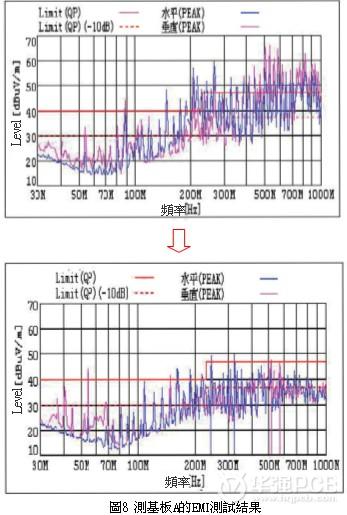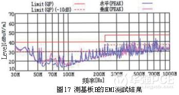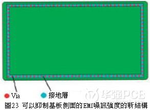 實際制作PCB時在基板側面鋪設Shield,同樣會面臨成本上升的質(zhì)疑,類似圖23在基板側面附近設置接地Plane與連續(xù)性貫穿Via的新結構,除了可是解決成本問題之外,還可以有效抑制基板側面的EMI噪訊強度;圖24是結合以上各種EMI噪訊對策的PCB測試結果。