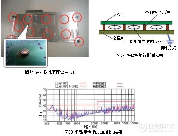 Return電流流動時PCB內(nèi)的接地Plane會產(chǎn)生電位差,該電位差往往是EMI噪訊的發(fā)生原因之一,而且可能會通過PCB形成所謂的二次噪訊,因此將接地Plane與金屬板作多點連接(圖18、圖19),使PCB的側面與中心位置得電位差均勻化,同時降低接地Plane本身的阻抗(Impedance)并抑制電壓下降。