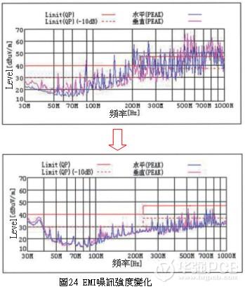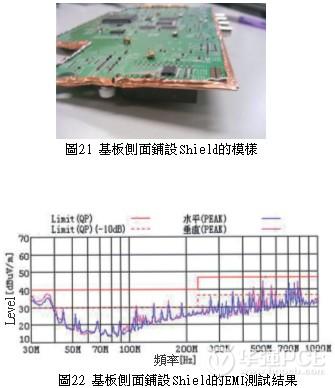 圖21是在基板側面鋪設Shield的實際外觀,具體方法是在基板側面粘貼導電膠帶,試圖藉此抑制基板內(nèi)層信號線、Via與電源Plane的噪訊,接著再與外層接地Plane連接,測試基板側面的EMI噪訊遮蔽效果,圖22是基板側面鋪設Shield的EMI測試結果,根據(jù)測試結果顯示200MHz以下時EMI噪訊強度有下降趨勢,甚至符合規(guī)范的Level,證實基板側面鋪設Shield確實可以抑制EMI噪訊。