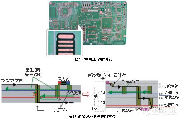 改變被測基板結構主要理由是一般4層基板的Return路徑,通常都設有可以通行電源Plane或是最短距離接地,因此在貫穿部位經(jīng)常造成Return路徑迂回問題,如果信號導線包覆接地Plan e,如此一來大部份的Return路徑會流入接地 Plane,進而解決Return路徑迂回的困擾,被測基板B就是根據(jù)上述構想制成 ,因此Return路徑在PCB整體減少30%,同時縮減信號圖案與Return路徑構成的電流Loop距離,進而達成EMI噪訊抑制的目的。圖16是被測基板B的各層結構圖。
