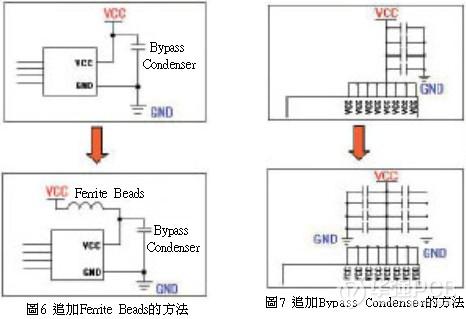 ?各IC電源輸入線的Bypass Condenser與電源之間,追加設置Ferrite Beads(圖6)。