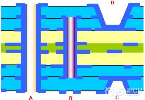 為了讓有限的PCB面積,能放置更多更高性能的零件,除線路寬度愈細外,孔徑亦從DIP插孔孔徑1 mm縮小為SMD的0.6 mm,更進一步縮小為0.4mm以下。但是仍會占用表面積,因而又有埋孔及盲孔的出現(xiàn),其定義如下: