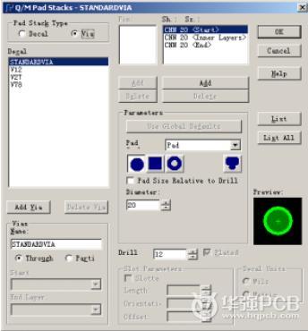 點擊菜單的Setup-Pad Stacks,再選擇Pad Stack Type中的Via選項,出現(xiàn)如右圖設置對話框。