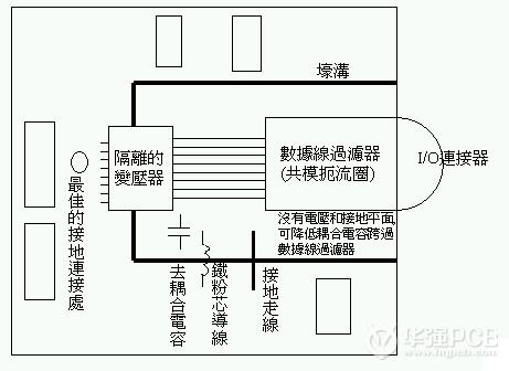 有兩種方法可以將走線、供電、接地平面連接至這個(gè)「孤島」上。第一種方法是使用隔離的變壓器、光學(xué)隔離器、或共模數(shù)據(jù)線過(guò)濾器,來(lái)跨越「壕溝」。第二種方法是使用「壕溝」上的一個(gè)「橋梁」。隔離也被應(yīng)用在將高頻寬組件與低頻電路分開(kāi)的場(chǎng)合;此外,它也被應(yīng)用于使I/O界面維持在低的EMI頻寬----亦即從I/O互連電路傳播出來(lái)的射頻頻譜大小。