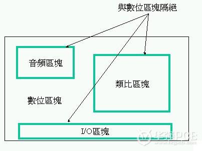 「安靜區(qū)域」是和數(shù)字電路、模擬電路、供電和接地平面隔離的區(qū)域。這種隔離可以避免其它PCB區(qū)塊內(nèi)的噪聲源,破壞了敏感電路。例如:來(lái)自數(shù)字區(qū)塊的供電平面噪聲,滲入至模擬裝置(模擬區(qū)塊)、音頻裝置(音頻區(qū)塊)、I/O濾波器、互連電路…..等的供電接腳,如附圖一。