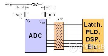 但是,在有些情況下,要將輸出電容降低到足以消除所引起的感應噪聲的水平是不可能的。尤其是當ADC的精度很高、參考電壓和訊號電壓水平很低并采樣率很高時,情況更是如此。這時候在盡量靠近ADC輸出引腳的地方串聯(lián)一個47到100奧姆的電阻器會有所幫助,因為串聯(lián)電阻可以限制ADC輸出引腳電容器充電和放電的電流,降低芯片上的噪聲。請參見圖8。