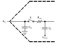 現(xiàn)下生產(chǎn)的絕大多數(shù)ADC都可以被看成采樣轉(zhuǎn)換器,也就是說,他們對輸入訊號進行采樣并把采樣的電壓轉(zhuǎn)換為相應的數(shù)值。圖5顯示了一個簡化的、采樣ADC輸入訊號的等效電路,圖中,"CIN"代表引腳的輸入電容,"CS"代表采樣電容器,"S"代表采樣開關,"RON"代表開關在接通狀態(tài)時的電阻。采樣的時候,開關"S"閉合,采樣電容器"CS"被充電至輸入電壓水平;在開關“S”斷開而另一個開關(圖中未顯示)閉合的轉(zhuǎn)換間隙,根據(jù)ADC設計的不同,采樣電容器上所施加的電壓被轉(zhuǎn)移到另外的一個或幾個電容器上。