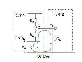 芯片A的輸出變化,產(chǎn)生地彈。這對芯片A的輸入邏輯是有影響的。接收邏輯把輸入電壓和芯片內(nèi)部的地電壓差分比較確定輸入,因此從接收邏輯來看就象輸入信號本身疊加了一個與地彈噪聲相同的噪聲。