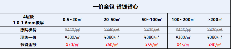 ● 1.0-1.6mm板材費,大小批量統(tǒng)一價。下單不必糾結(jié)面積區(qū)間,0.5㎡以上統(tǒng)統(tǒng)380元/㎡。